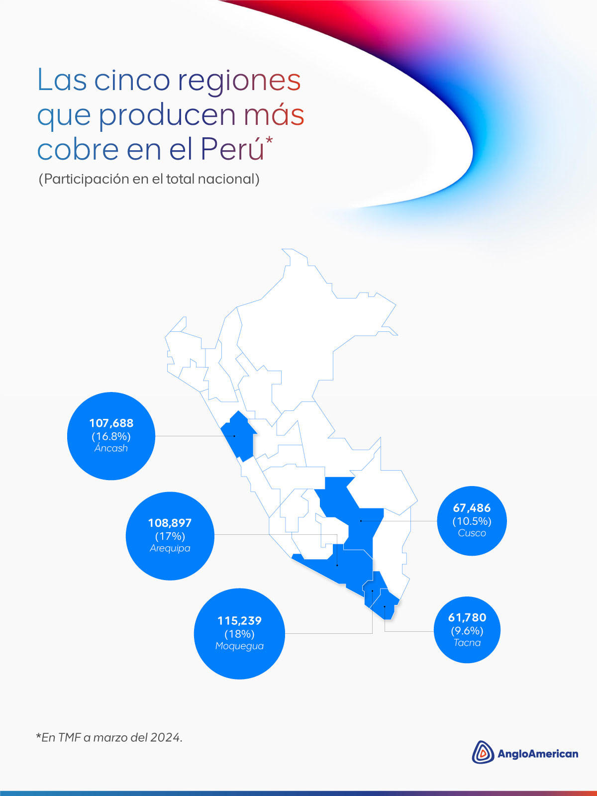 Al cierre del 2023, la producción peruana de cobre alcanzó los 2’755,066 TMF, un crecimiento del 12.7% en comparación al año anterior. Este 2024, Moquegua se mantiene como la región que más cobre produce, con el 18% del total nacional, equivalente a 115,239 TMF.