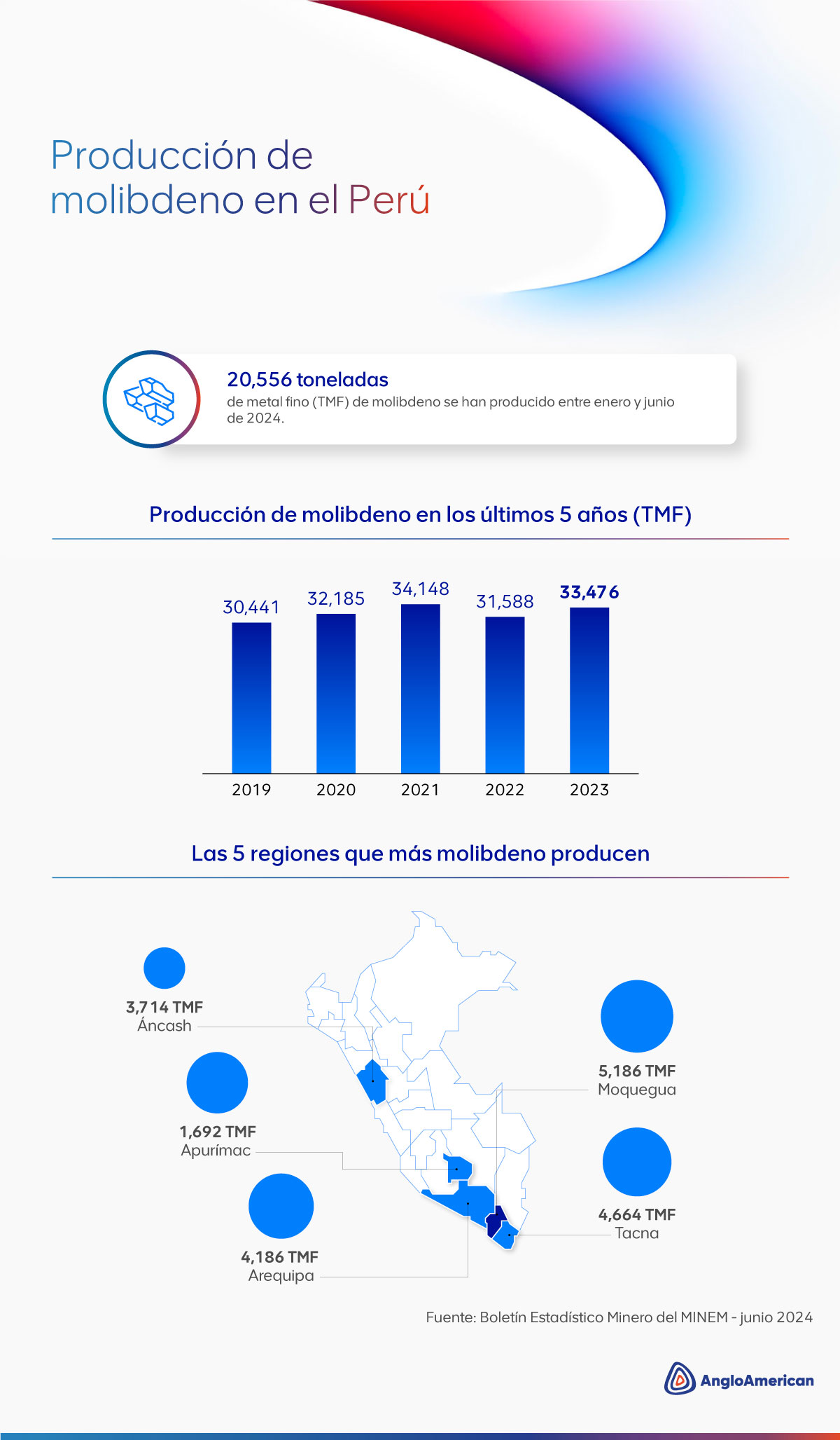 El país cuenta con importantes yacimientos de molibdeno asociados a minas de cobre, entre ellas nuestra operación minera Quellaveco, que hasta junio de 2024 producía el 15% del total de este importante metal.