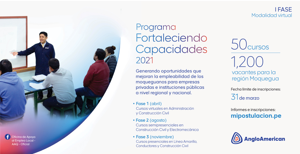 Y lo más importante: todos los cursos serán certificados por instituciones de prestigio como Tecsup, CISOLD y CERTUS. Asimismo, los egresados contarán con una formación adicional y certificada para postular a empresas de los sectores transportes, saneamiento, construcción civil, vivienda, agroindustria y minería, o instituciones públicas. Con las nuevas habilidades, podrán postular con mejores expectativas a puestos en Moquegua y en todo el Perú.