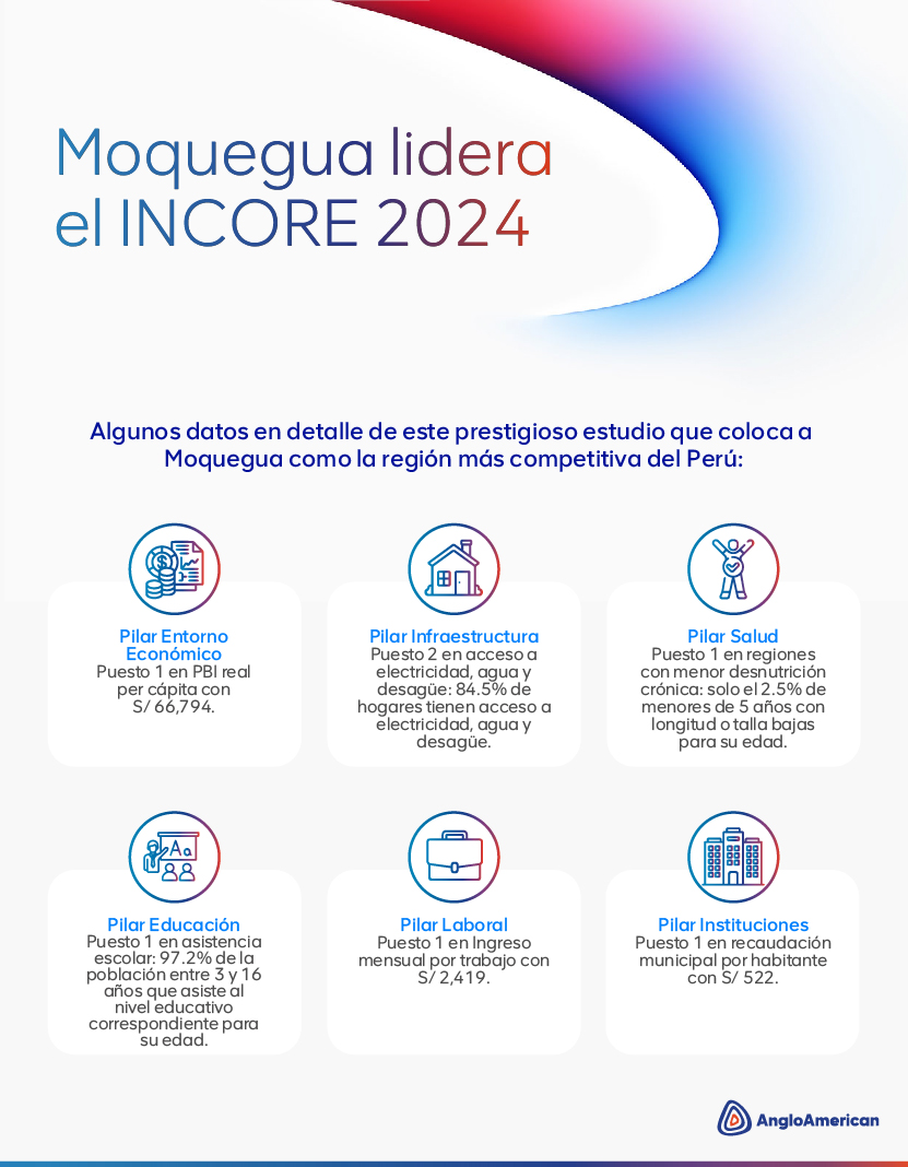 En la última edición del Índice de Competitividad Regional (INCORE), que todos los años actualiza el Instituto Peruano de Economía, la región Moquegua logró un hito importante al convertirse en la región más competitiva del país, desplazando al segundo lugar a Lima Metropolitana y Callao.