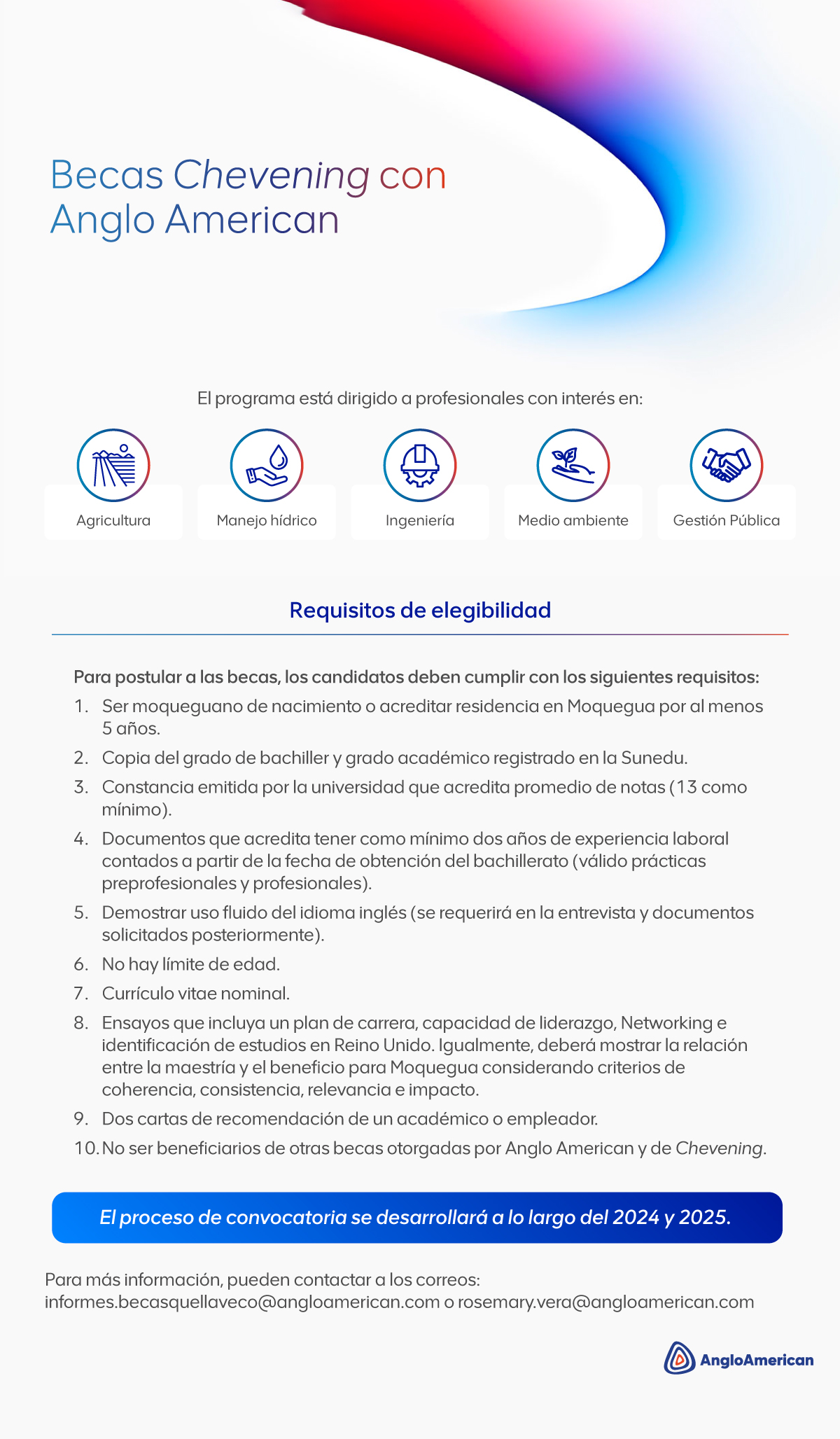Para acceder a esta oportunidad, los postulantes deben ser moqueguanos de nacimiento y/o acreditar residencia en la región por al menos cinco años, tener un grado académico superior (Bachiller, Licenciatura, Maestría y/o Doctorado), demostrar experiencia laboral (mínimo 2 años) y contar con un buen manejo del inglés.