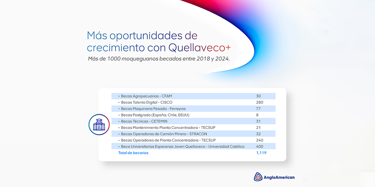 Una de ellas es nuestro programa Becas Quellaveco+, que ofrece becas de formación técnica, así como de pregrado y posgrado a nivel nacional e internacional.