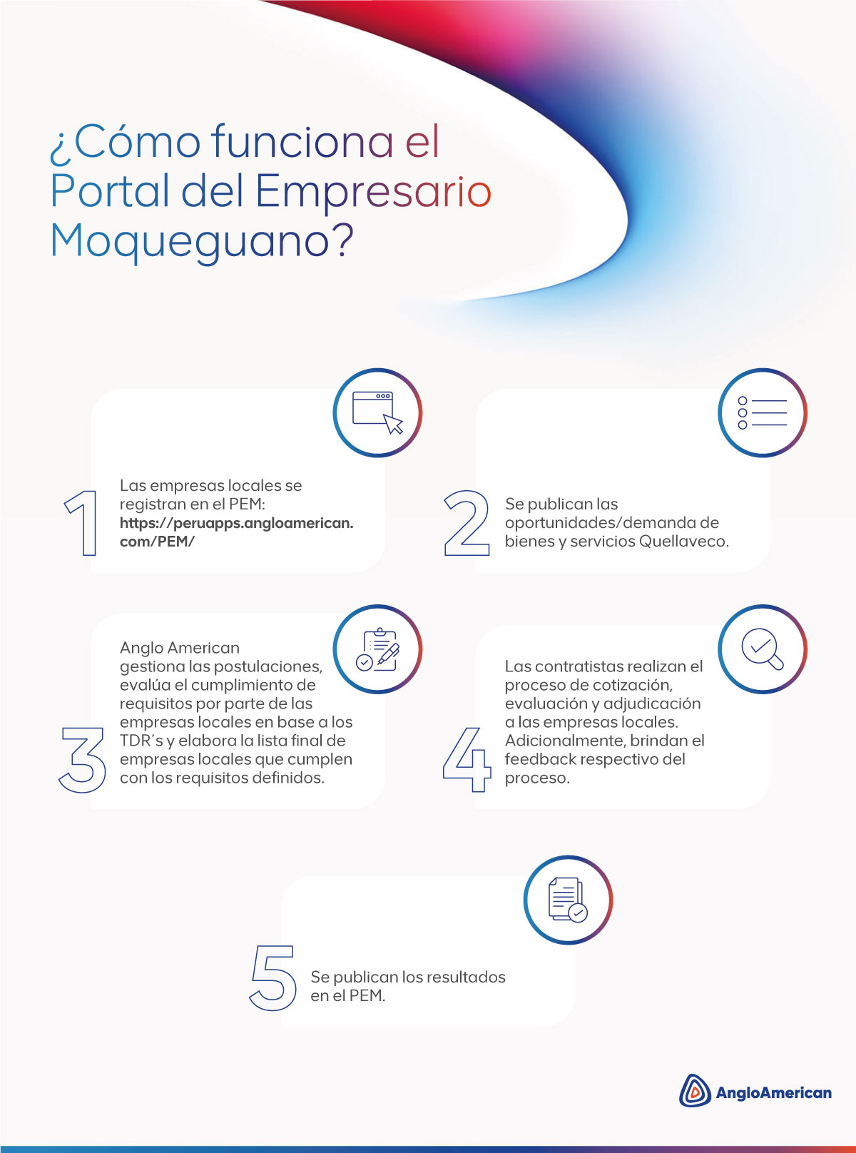 El Portal del Empresario Moqueguano (PEM) es un mecanismo implementado por Anglo American desde octubre del 2019, el cual se ha convertido en un modelo innovador que ha podido articular de forma transparente, abierta y competitiva, la demanda de bienes y servicios de Quellaveco, con la oferta de las empresas de la región Moquegua.