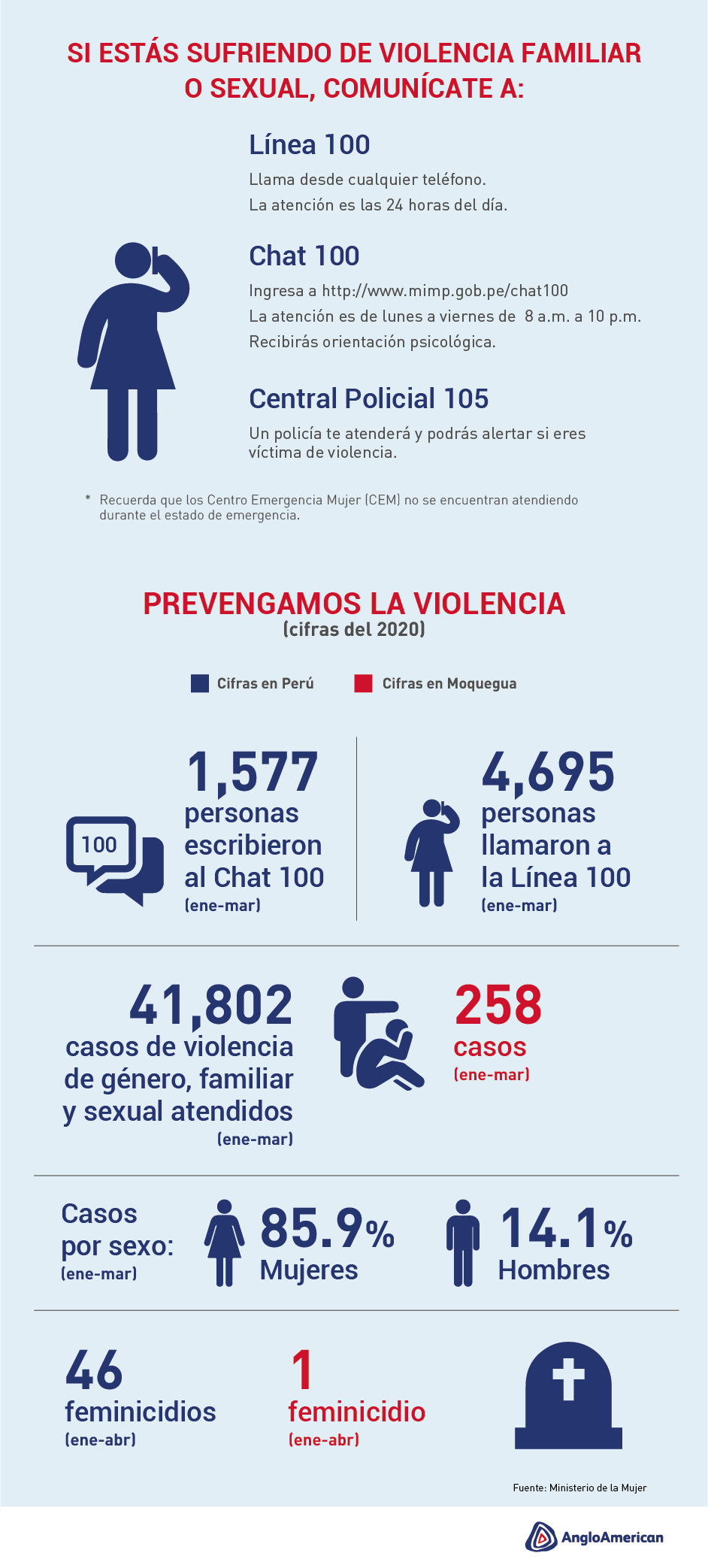 Por eso, en Anglo American nos hemos comprometido en la lucha contra la violencia de género y te proporcionamos información de canales gratuitos del Estado destinados a prevenir y tomar acción frente a casos que puedan vulnerar tu integridad o la de alguien cercano a ti. Te recordamos que existe la Ley N° 30364, que dispone medidas para prevenir, sancionar y erradicar la violencia contra las mujeres y los integrantes del grupo familiar.
